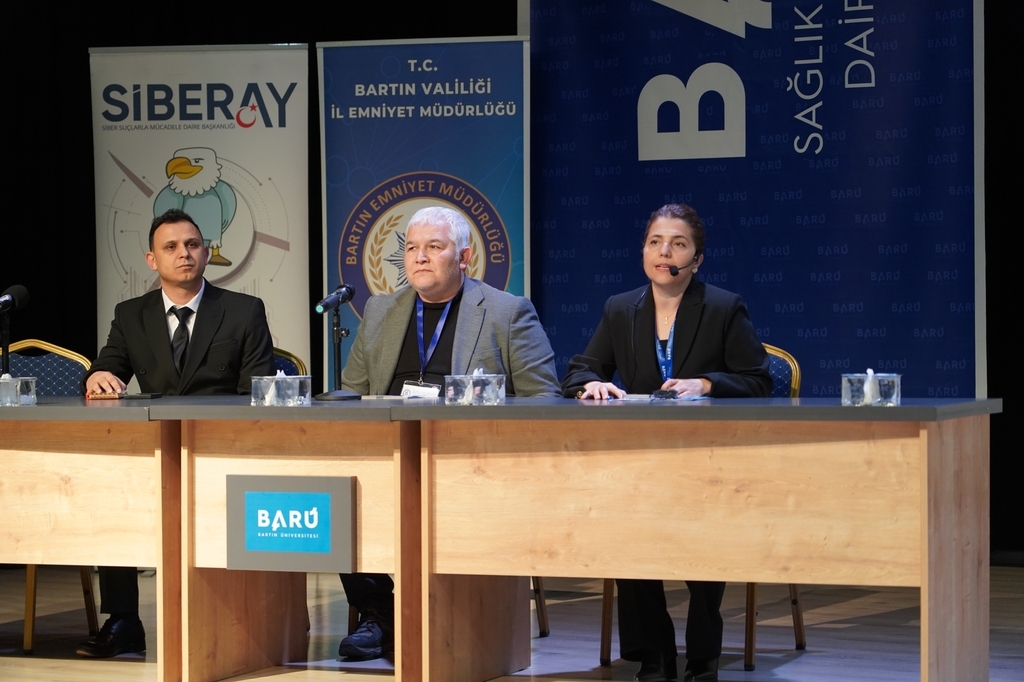 BARÜ İktisadi ve İdari Bilimler Fakültesinden Prof. Dr. Ümmühan Avcı moderatörlüğündeki “Çözüm Önerileri ve Gelecek Yol Haritası” başlıklı oturumda ise BAKKA Siber Vatan Program Koordinatörleri Kadir Kağan İnaloğlu ve Muhammed Temli ile Bartın İl Emniyet Müdürlüğü Siber Suçlarla Mücadele Şubesi’nden Necati Hamarat katılımcılara bilgiler verdi. Türkiye’nin dijital egemenlik vizyonu çerçevesinde yürütülen projeleri aktarılırken siber suçlarla mücadelede güncel tehditler ve alınması gereken önlemler hakkında bilgilendirmelerde bulunuldu.