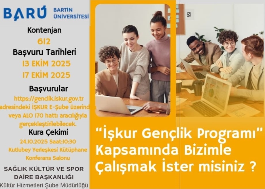 İŞKUR Gençlik Programı'na 13 Ekim 2025 - 17 Ekim 2025 tarihleri arasında https://genclik.iskur.gov.tr adresinden veya ALO 170 hattından başvuru yapabilirsiniz. Kura çekimi 24.10.2025 tarihinde Kutlubey Yerleşkesi Kütüphane Konferans Salonu'nda gerçekleşecektir.