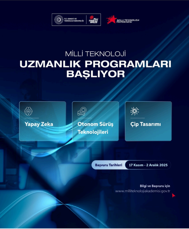 Bu doğrultuda 17.11.2025 tarihinde başlayan Milli Teknoloji Uzmanlık Programları başvuruları 02.12.2025 tarihinde sonlanacaktır. Programa ait başvuru kabul kriterleri, eğitim müfredatı gibi daha detaylı bilgiler www.milliteknolojiakademisi.gov.tr internet adresinde yer almaktadır. Başvuru kriterlerine ulaşmak için tıklayınız.